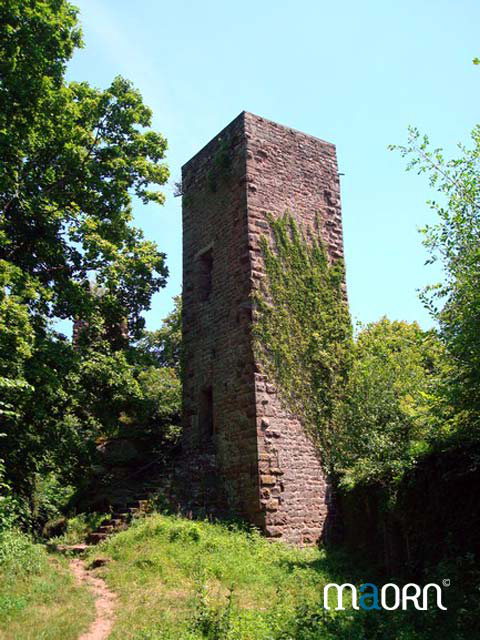 Reprendre la randonnée balisée rectangle bleu vers le château. A un moment donné, il faudra quitter le chemin pour un sentier qui descend doucement et part à droite pareillement balisé. Possibilité de monter dans le donjon pour admirer le paysage vers les châteaux du Haut Barr et des Geroldseck et la ville de Saverne.