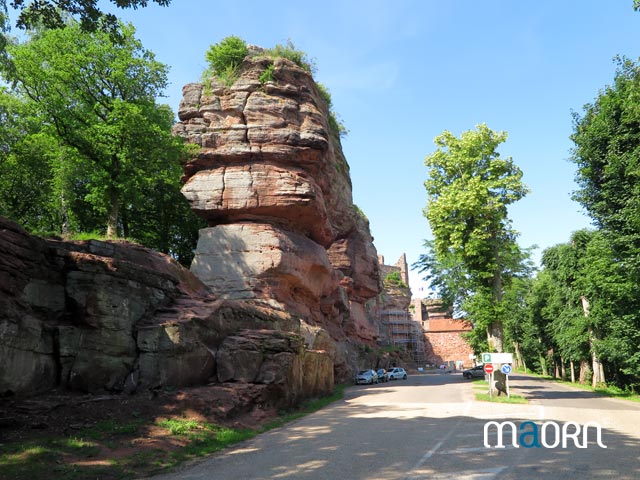 Depuis le parking, suivre le sentier balisé rectangle rouge. Vous passez par la Tour Chappe, le Château du Grand Géroldseck, le Château du Petit Géroldseck et arrivez ensuite à la route forestière au lieu-dit Table des Sorcières.